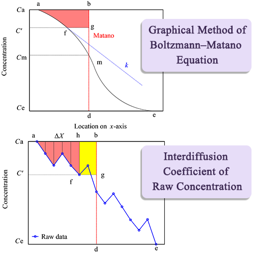 A new method is proposed to calculate the interdiffusion coefficients using the raw concentration data obtained by EPMA, which is based on the graphical method of the Boltzmann–Matano equation. It calculates the areas and determines the Matano interface using the trapezoidal rule, and estimates the slopes using five-point differentiation formulae. Its biggest advantage is that the raw concentration data do not need smoothing or fitting, and can be directly applied in IDCRC.
